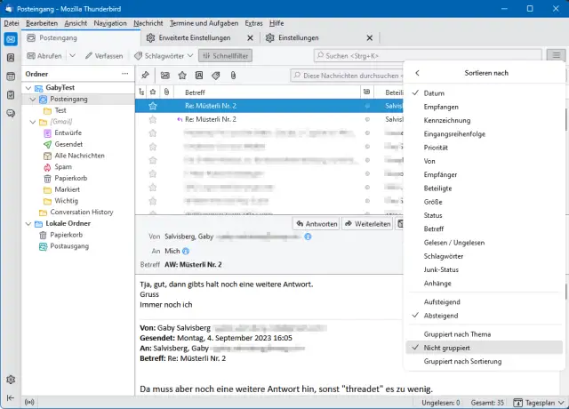 Je nach Mailgewohnheiten ist diese Art von Mailgruppierung jedoch störend. Das liegt teils auch daran, weil Folgendes häufig passiert: Sie hatten vor ein paar Wochen einen Mailwechsel mit Person A, vielleicht zum Thema «Vorstandssitzung». Nun trifft von Person A eine andere Mail zu einem völlig anderen Thema ein, etwa «Biergarten». Dennoch sortiert Ihr Mailprogramm (hier: Thunderbird) die neue Mail in den gleichen Mailwechsel ein. Das passiert, weil Mailprogramme die Mails nicht nach Betreff gruppieren, sondern nach Message-ID. Die Person A hat für die Mail zum neuen Thema einfach bei einer älteren Mail auf Antworten geklickt und den Betreff geändert. In den Mail-Kopfzeilen kommt aber die Info mit, dass diese neue Mail eine Antwort an eine Message-ID ist, die zu einem bestehenden Thema gehört. Und so landet die Nachricht mit Betreff «Biergarten» vielleicht im Thread, der sich zuvor zum «Vorstandssitzung» drehte. Spätestens dann wird Threading etwas nervig.
