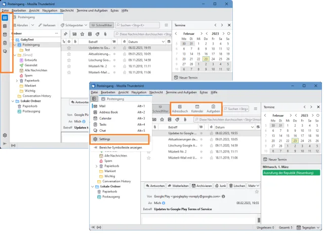 Ähnlich wie bei Outlook wurden auch im Thunderbird dort neuerdings die Icons für die Module Mail, Adressbuch, Kalender, Aufgaben, Chat und für die Einstellungen untergebracht.