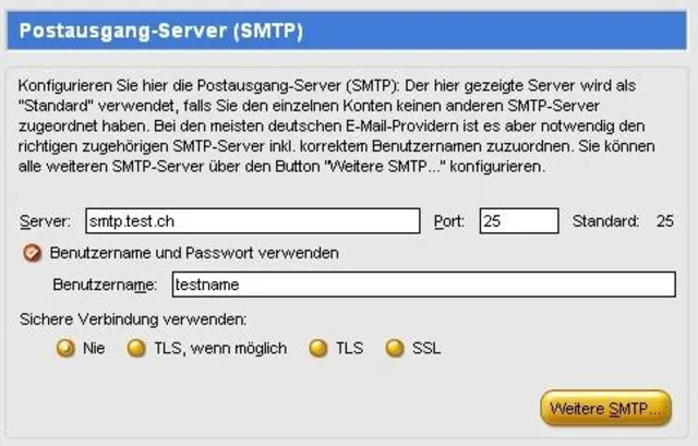 Den Server für den Postausgang finden Sie im Thunderbird unter "Extras/Konten/Postausgang-Server (SMTP)". Dort geben Sie den Namen des SMTP-Servers und Ihren Benutzernamen ein.