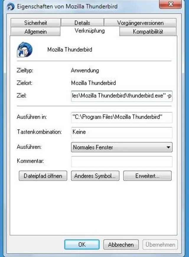 Quelle: PCtipp.chWichtig ist hierbei, dass Sie das «.exe» nicht vergessen, sonst startet Thunderbird automatisch mit dem Standardprofil.