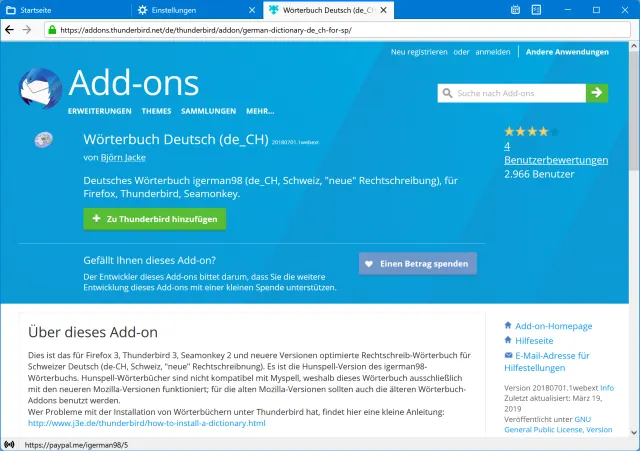 Quelle: PCtipp.chScrollen Sie zu German (Switzerland). Hier stehen zwei Wörterbücher von verschiedenen Entwicklern zur Wahl. Ich greife normalerweise zur etwas grösseren Datei, da ich darin mehr Wörter und Wortformen vermute. Wörterbücher sind eigentlich Add-ons, darum landen Sie in Thunderbirds Add-on-Portal. Klicken Sie auf Zu Thunderbird hinzufügen, bestätigen Sie die Rückfrage mit Hinzufügen und klicken Sie auf OK.