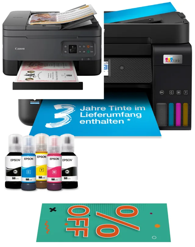 Gegenüber dem Laserdruck spielen die Tinten-Allrounder ihre Vorteile bei der kompakten Grösse, dem geringen Stromverbrauch und der fehlenden Feinstaubproblematik aus. Und weil die Tintenstrahldruck-Technologie keine Rasterung auf dem Foto hinterlässt, sind hochwertige Geräte, die mit fünf oder sechs einzelnen Patronen drucken, sogar für professionelle Fotoausdrucke eine sehr gut Alternative zum Druck in Fotostudios.