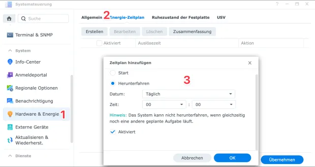 Öffnen Sie dazu auf dem Synology-Gerät die Systemsteuerung. Klicken Sie in der linken Spalte auf den Eintrag Hardware & Energie (1). Wechseln Sie in den Bereich Energie-Zeitplan (2) und legen Sie die Ein- und Ausschaltzeiten fest. (3)