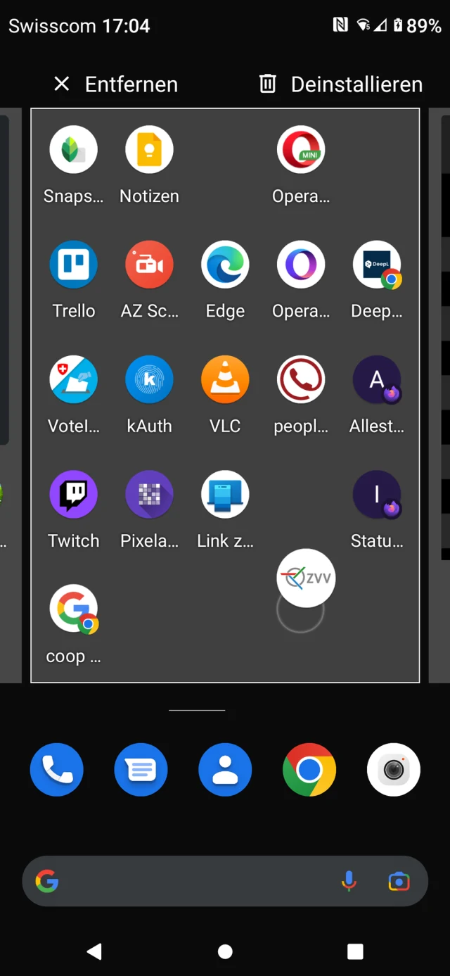 Quelle: PCtipp.chDrücken Sie etwas länger auf ein App-Symbol und bewegen Sie es ein paar Millimeter, wechselt der Homescreen in eine Art Editiermodus. Ziehen Sie das App-Symbol zum Beispiel an eine andere Stelle. Wollen Sie dem Homescreen eine zusätzliche Seite spendieren, ziehen Sie das Icon einfach über den rechten Rand hinaus. Falls sich dort keine weitere Seite befindet, entsteht eine neue. Lassen Sie das Symbol los, um es an der neuen Stelle abzulegen. Beim Standard-Android 11 erscheinen in diesem Editiermodus oben auch zwei zusätzliche Schaltflächen, auf die Sie die App ziehen könnten. Entfernen beseitigt die App vom Homescreen. Deinstallieren entfernt die App hingegen komplett vom Gerät, Bild 2.