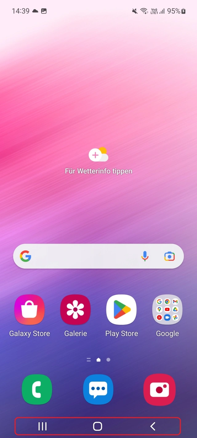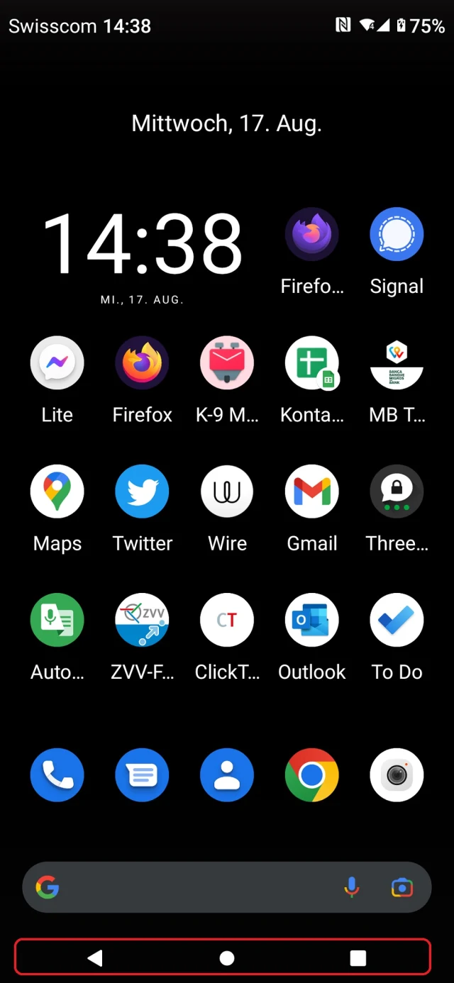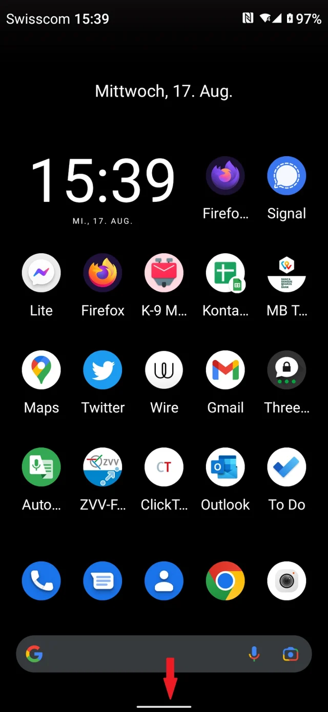 Unten finden Sie meist nebst vier bis fünf Standardverknüpfungen auch die Google-Suchleiste und – je nach Einstellung – auch Bediensymbole. Unter Android gibts mehrere verschiedene Bedienkonzepte, zwei unterscheiden sich sehr stark: eine mit drei Symbolen und eine mit einem simplen Strich am unteren Rand. Je nachdem, welches Konzept aktiv ist, funktionieren die Gesten etwas anders.