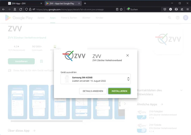 Wie Sie Apps updaten, haben Sie bereits im Abschnitt «Play-Store-App» im Teil 2 gelesen. Wollen Sie eine neue installieren? Die Suche im Play Store ist mühselig. Ausserdem findet sich darin viel Untaugliches. Bequemer ist es vom Desktop-Webbrowser aus: Loggen Sie sich im Desktop-Webbrowser mit dem gleichen Google-Konto ein, das Sie auch auf Ihrem Android-Smartphone verwenden. Welches das ist, erfahren Sie unter Einstellungen/Google. Besuchen Sie auf dem Desktop-PC die Webseite des App-Anbieters, auf der die App bestimmt irgendwo verlinkt ist. Damit landen Sie sicher bei der richtigen App. Zum Beispiel die ZVV-App ist auf der Seite des Zürcher Verkehrsverbunds zvv.ch unter Service/Apps verlinkt. Klicken Sie dort auf den Google-Play-Button, Bild 10.