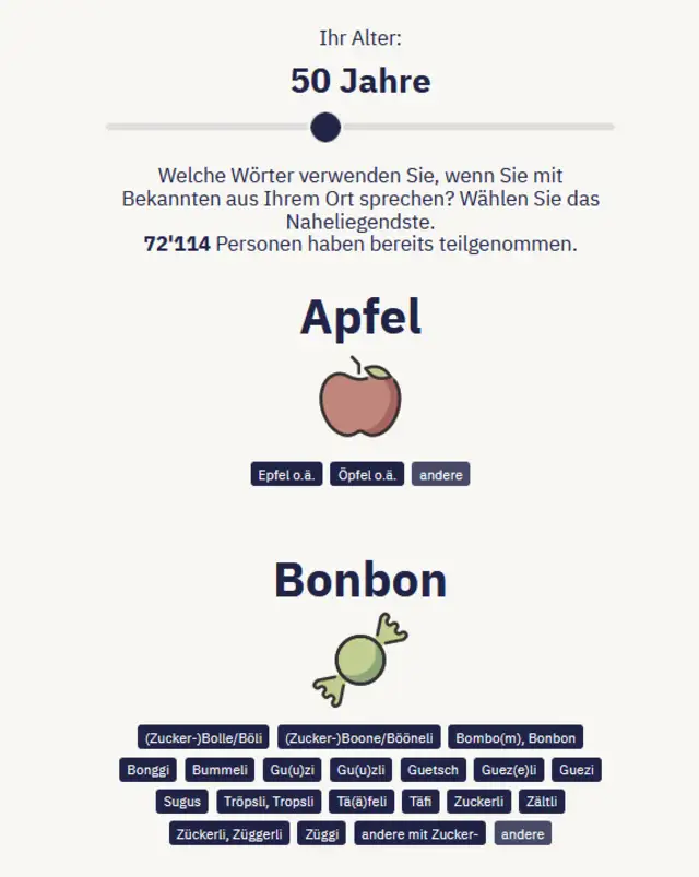 Sagen Sie «Hitzgi» oder «Gluxi» für Schluckauf? Das Daten- & Interaktiv-Team vom «Tages-Anzeiger» hat in Zusammenarbeit mit dem Germanistik-Professor Adrian Leeman und Carina Steiner von der Uni Bern einen Dialekt-Kalkulator entwickelt.
