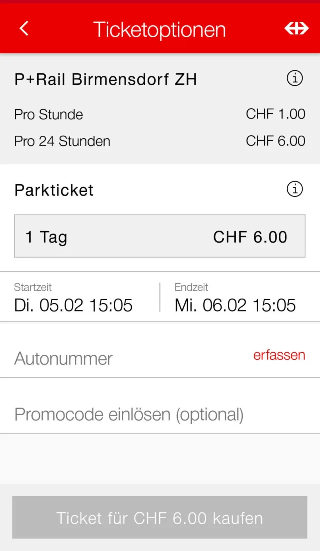Man erfasst «seinen» P+Rail-Standort; mehrere Standorte zu erfassen, ist ebenfalls möglich. Nach einem Tipp darauf sieht man, wie viel am entsprechenden Ort ein Parkplatz pro Stunde respektive für 24 Stunden sowie ein Tages-Parkbillett kostet. Start- und Endzeit sind einstellbar. Einen Parkplatz zu reservieren, ist nicht möglich.