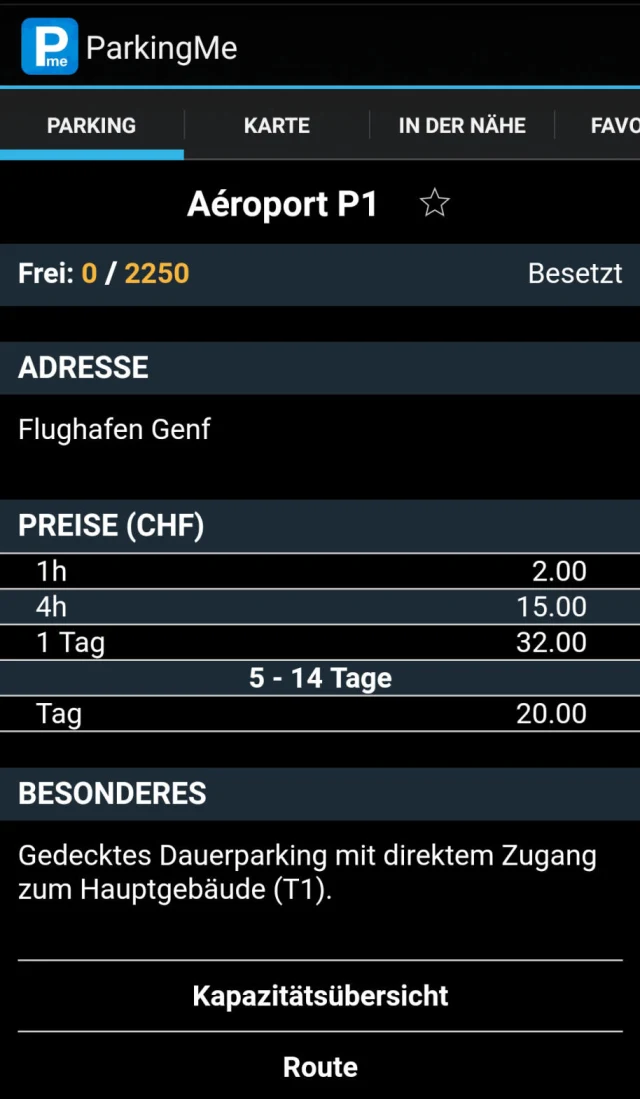 Das Finden eines Parkplatzes ist laut Entwickler verfügbar für alle Schweizer Städte, die ein Parkleitsystem (PLS) eingerichtet haben. In der App gibt es die Tabs Parking, Karte, in der Nähe und Favoriten.