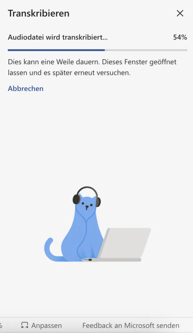 Mit der zweiten Option nehmen Sie wie bei der Diktierfunktion Audio von Ihrem Mikrofon auf. Die Datei wird an die Microsoft-Server geschickt, verarbeitet und Ihnen als Vorschau zurückgesendet.