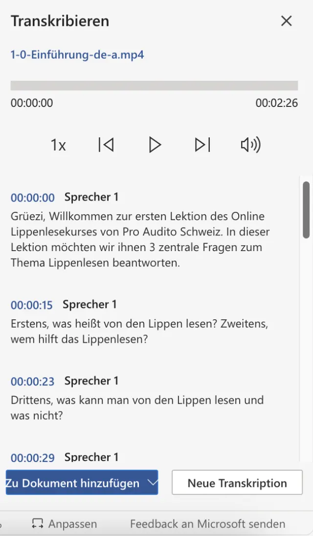 Quelle: PCtipp.chNachdem Sie die Sprache ausgewählt haben, müssen Sie eine zweite Entscheidung treffen: Wollen Sie eine Audiodatei hochladen oder direkt über das Mikrofon diktieren. Bei Ersterem laden Sie via Schaltfläche Audio hochladen eine Audiodatei auf die Microsoft-Server hoch, die danach transkribiert wird. Word unterstützt gängige Dateiformate wie WAV, MP3, M4A und auch MP4-Videodateien. Word verarbeitet anschliessend die Datei. Sobald dies erledigt ist, erhalten Sie eine Vorschau der Transkription und können diese mit der Schaltfläche Zu Dokument hinzufügen in das Word-Dokument einfügen. Dabei haben Sie die Wahl, ausser dem Text auch Metadaten wie die Sprecher oder Zeitangaben einzufügen.