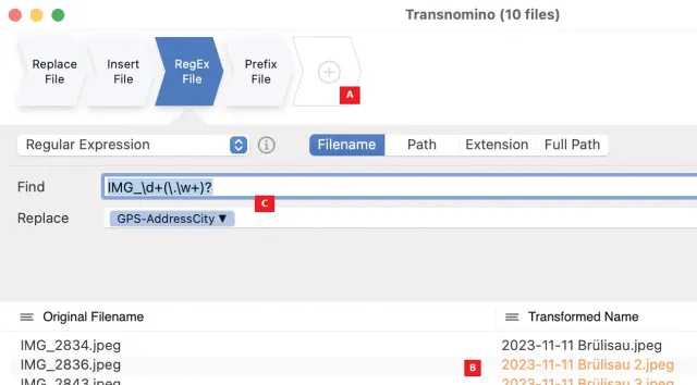 Die App Transnomino hat sich ganz dem Umbenennen von Dateien verschrieben. Neben banalen Aufgaben wie «Suche nach ABC und ersetze durch XYZ» bietet diese Software alles, was man sich unter dem Thema auch nur im Entferntesten vorstellen kann. Dabei durchläuft eine Umbenennung bei Bedarf mehrere Arbeitsschritte, die im oberen Bereich aneinandergereiht werden, Bild 1 A. Wie sich das auf die Umbenennung auswirkt, wird noch vor