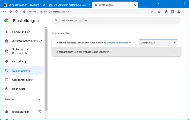 In Google Chrome: Google wird diesen Tipp nicht gerade lieben, gibt sich aber gegenüber alternativen Suchmaschinen ebenfalls einigermassen offen. Öffnen Sie in Google Chrome oben rechts über das Drei-Punkte-Icon das Menü und gehen Sie zu den Einstellungen. Klicken Sie in der linken Spalte auf Suchmaschine. Klappen Sie hinter In der Adressleiste verwendete Suchmaschine das Menü auf und schalten Sie auf DuckDuckGo um. Vorinstalliert wären in der Regel noch Google selbst, Yahoo und Bing. Sollte DuckDuckGo dort fehlen, entdecken Sie es vielleicht via Suchmaschinen und die Websitesuche verwalten. Klicken Sie dahinter aufs Drei-Punkte-Icon und greifen Sie zu Als Standard festlegen.