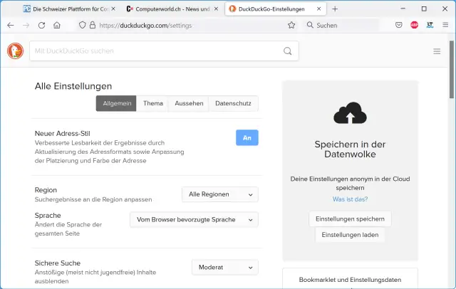 Einige Beispiele: Im Reiter Allgemein finden die Region, die Sie auf Switzerland (de) umschalten können. Falls Sie Suchresultate nicht schon gewohnheitsmässig manuell mittels Ctrl+Klick in einem neuen Fenster oder Tab öffnen, aktivieren Sie Neues Fenster.
