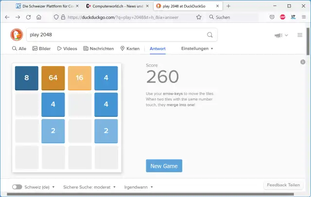 Suchen Sie auf DuckDuckGo nach play 2048. Nun erscheint ein ominöses Quadrat mit einer Ziffer 2. Klicken Sie auf New Game, fängt ein Spiel namens 2048 an. Drücken Sie die Pfeiltasten, um die Zahlen zu bewegen. Bei jedem Drücken erscheint eine neue Ziffer. Wenn zwei gleiche Zahlen sich horizontal oder vertikal so aufeinanderschieben lassen, addieren sie sich und geben die Felder wieder frei. Das Ziel ist, eine möglichst hohe Punktzahl zu erreichen. Hier könnten wir die Pfeil-Rauf-Taste drücken, um die beiden Vieren in der rechten Spalte zu addieren.