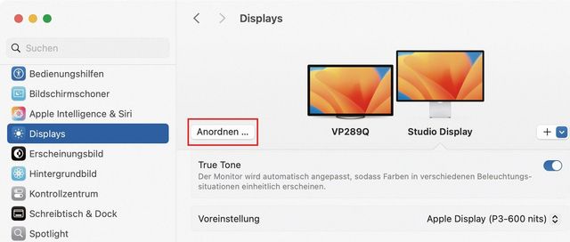 Wenn mehr als ein Display angeschlossen ist, sollten Sie es in derselben Systemeinstellung korrekt anordnen. Das heisst: Wenn der Mauszeiger das Display am Rand verlässt, taucht er auf der anderen Seite an der richtigen Stelle auf. Klicken Sie dazu auf die Schaltfläche Anordnen, Bild 3. Nun bringen Sie die Monitor-Symbole so in Stellung, dass die Position jener auf dem Schreibtisch entspricht.