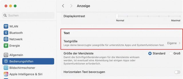 Einige Anwendungen bieten zusätzlich die Möglichkeit, nur den Text zu skalieren. Welche das sind, sehen Sie in der Systemeinstellung Bedienungshilfen im Bereich Anzeige, Bild 4. Hier besteht auch die Möglichkeit, die Grösse gleich an Ort und Stelle zu ändern.