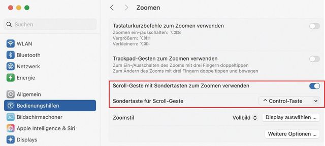 Die Zoom-Funktion muss manuell aktiviert werden. Öffnen Sie in der Systemeinstellung Bedienungshilfen den Bereich Zoomen. Aktivieren Sie die Option Scroll-Geste mit Sondertasten zum Zoomen verwenden und wählen Sie aus, welche Modifikationstaste gedrückt werden muss – also zum Beispiel die Control-Taste, Bild 5. Während diese Taste gedrückt wird, kann nun mit dem Scrollrad der Maus oder mit dem Trackpad in die Darstellung hinein skaliert werden. Nach kurzer Zeit wird dieser Kniff zur zweiten Natur.