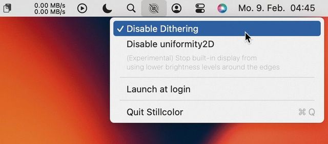 Das kleine Tool Stillcontrol funktioniert so einfach wie ein Schalter. Nach dem Start erscheint ein neuer Eintrag in der Menüleiste, mit dem das temporale Dithering (de-)aktiviert wird, Bild 7. Wer von diesem unangenehmen Effekt betroffen ist, wird den Unterschied in kürzester Zeit feststellen.