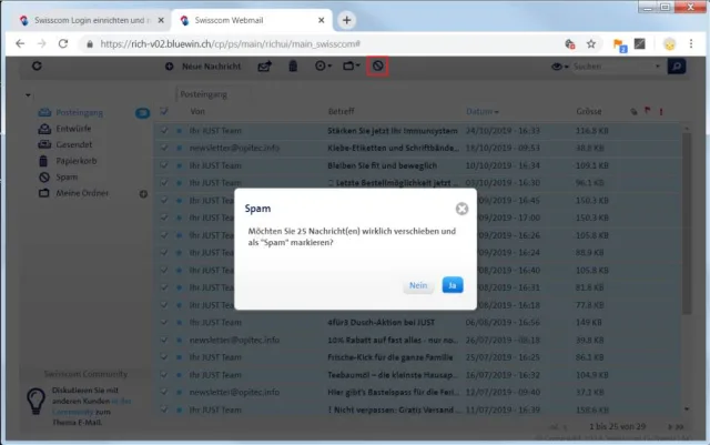 Falls Ihnen dies nicht zusagt, loggen Sie sich aber dennoch hie und da per Browser ein, etwa nach ein paar Tagen Abwesenheit. Markieren Sie die unerwünschten Mails und klicken Sie aufs Spam-melden-Symbol, Bild 3. Die so gewonnenen Erkenntnisse betreffend Inhalt und Herkunft der Mail wird der Provider zum Optimieren seines gesamten Spam-Filter-Systems benutzen. Und davon profitieren all seine Kunden.