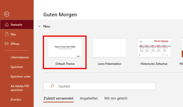 Wenn Sie das nächste Mal eine neue Präsentation öffnen, sehen Sie auf der Startseite von PowerPoint links neben dem Eintrag Leere Präsentation die von Ihnen gespeicherte Vorlage, die mit dem Namen Default Theme angeschrieben ist, Bild 3.