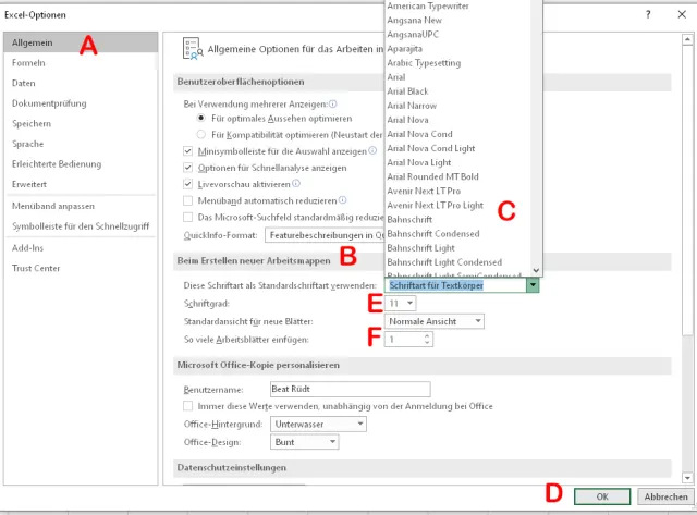 Excel ist primär ein Programm für die Tabellenkalkulation und bietet deshalb deutlich weniger Gestaltungsmöglichkeiten als Word und PowerPoint. Das mag mit ein Grund sein, warum es für Excel keine Möglichkeit gibt, eine Standardvorlage abzuspeichern. Sie können aber immerhin festlegen, welche Schrift in den Feldern verwendet werden soll.Klicken Sie zuerst auf den Menüpunkt Datei und links im Menü auf Optionen. Das Fenster Excel-Optionen wird im Bereich Allgemein geöffnet, Bild 4 A. Scrollen Sie jetzt runter zum Titel Beim Erstellen von Arbeitsmappen B und wählen Sie bei Diese Schriftart als Standard-Schriftart verwenden aus dem Menü die gewünschte Schriftart aus C. Schliessen Sie die Eingabe mit einem Klick auf OK D ab. Diese Veränderung wird erst aktiv, wenn Sie Excel das nächste Mal starten.