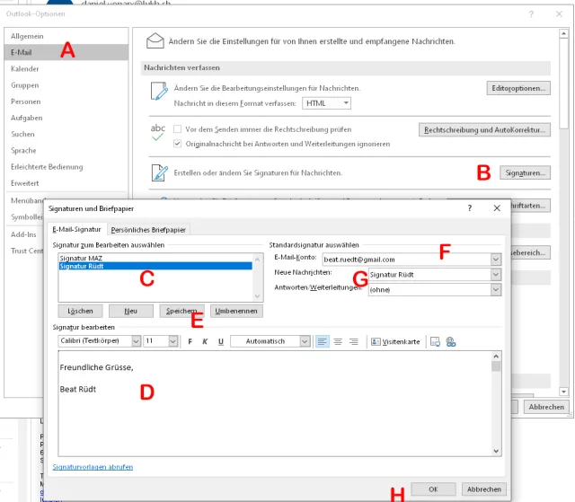 Schliesslich legen Sie noch fest, ob die Signatur nur in neuen Nachrichten oder auch beim Antworten oder Weiterleiten eingefügt werden soll G. Beenden Sie abschliessend das Einrichten der Signatur mit einem Klick auf den Knopf OK H.