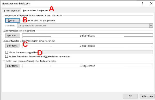 Im Fenster mit den Signatur-Einstellungen finden Sie auch den Reiter Persönliches Briefpapier, Bild 6 A. Hier können Sie ein paar praktische Einstellungen vornehmen, die wenig bekannt sind: