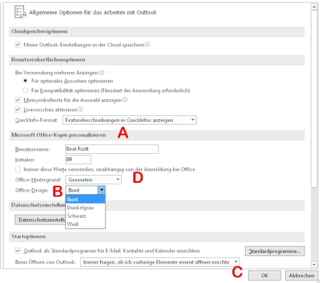 Quelle: PCtipp.chAus dem Menü bei Office-Design B werden Sie die Farben los, indem Sie Dunkelgrau, Schwarz oder Weiss wählen. Sobald Sie unten im Fenster auf die Schaltfläche OK C klicken, wird die Einstellung für sämtliche Programme übernommen.