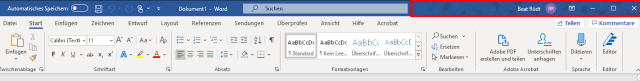 Nebst der Farbe können Sie auch einen Hintergrund auswählen, der in allen Office-Programmen angezeigt wird. Die Einstellung ist gleich oberhalb der Farbauswahl D. Erwarten Sie aber nicht zu viel von dieser Einstellung: Die Muster werden nur sehr diskret rechts oben im Balken angezeigt, Bild 9. Eine etwas grössere Fläche sehen Sie, wenn Sie im Menü auf Datei klicken.