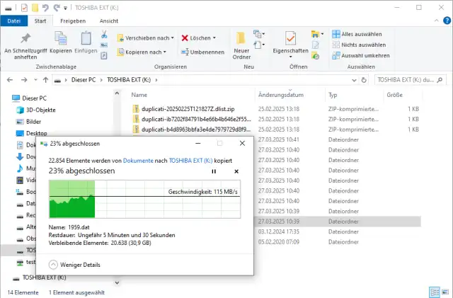 Bevor Sie fortfahren und Linux Mint auf Ihrem PC installieren, sollten Sie zuerst eine Sicherung aller wichtigen Daten auf ein externes Laufwerk erstellen. Damit schützen Sie Ihre Daten nicht nur, falls beim Installieren etwas schiefgeht, Sie können das Backup anschliessend auch verwenden, um Ihre persönlichen Daten nach dem Umstieg wieder einzuspielen. Am einfachsten und ohne Zusatz-Software kopieren Sie alle wichtigen Dateien mit dem Datei-Explorer von Windows auf ein geeignetes externes Laufwerk, Bild 2.