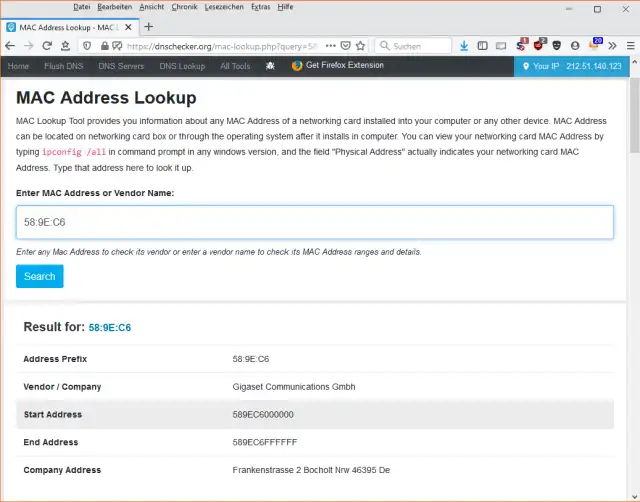 Probieren Sie es einmal aus! Surfen Sie zur Webseite https://dnschecker.org/mac-lookup.php, die nebst Domainennamen-Abfragen auch eine Abfrage für MAC-Adressen bietet. Die meisten solchen MAC-Adressen-Abfrageformulare verstehen die Eingaben nur mit Bindestrichen (z.B. 58-9E-C6), aber hier können Sie auch die Schreibweise mit den Doppelpunkten verwenden. Und schon lösen Sie ein Rätsel nach dem anderen.