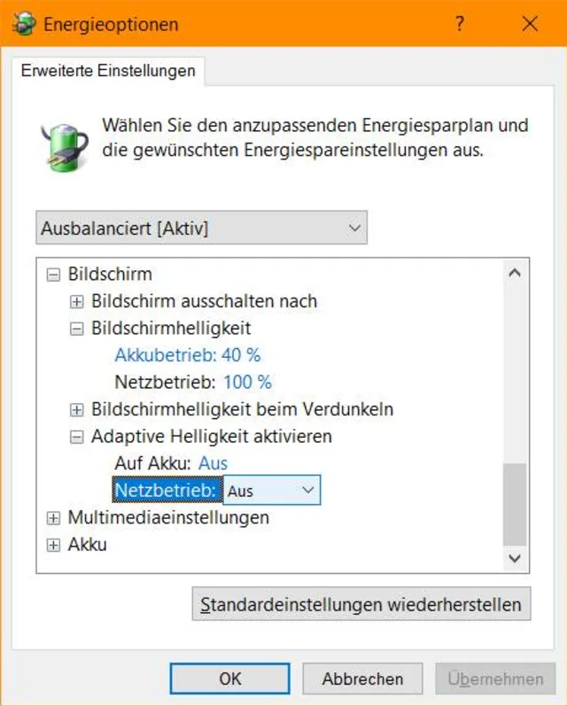 Quelle: PCtipp.chSollte kein herstellerseitiges Update verfügbar sein oder jenes nichts nützen, gibts eine Windows-Einstellung, mit der Sie das Verhalten beeinflussen können. Öffnen Sie die Systemsteuerung und darin die Energieoptionen. Falls Sie diese nicht gleich finden, tippen Sie oben rechts energie ein. Klicken Sie beim benutzten Plan auf Energiesparplaneinstellungen ändern. Von dort aus gehts weiter über den unscheinbaren Link Erweiterte Energieeinstellungen ändern. Klappen Sie Bildschirm oder Display auf. Falls Ihr Gerät die adaptive Helligkeit unterstützt, finden Sie hier einen Eintrag Adaptive Helligkeit aktivieren. Schalten Sie diese bei Bedarf sowohl bei «Auf Akku» als auch bei «Netzbetrieb» auf «Aus» und klicken Sie auf OK. (PCtipp-Forum)