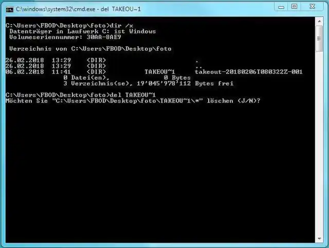 7. Tippen Sie del TAKEOU~1 und drücken Sie Enter. Nützlicher Geheimtipp: Die Eingabeaufforderung kann Datei- und Ordnernamen vervollständigen. Falls dieser Ordner der einzige ist, der mit «take» beginnt, können Sie auch del take eintippen und die Tabulator-Taste drücken. Die Kommandozeile ergänzt den Datei- oder Ordnernamen automatisch. Das erspart Ihnen die Suche nach irgendwelchen Sonderzeichen. Drücken Sie Enter, falls der Name richtig ergänzt wurde.