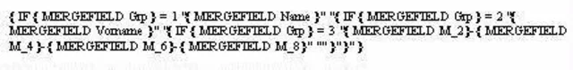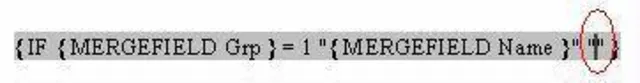 Hier fügen Sie nun die Seriendruckfelder ein, die für diese Gruppe ausgegeben werden soll. Im Beispiel soll bei der Gruppe 1 nur der Name werden. Platzieren Sie danach gleich den Cursor zwischen dem nächsten Anführungszeichen-Paar