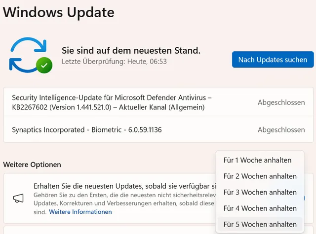 Unter Windows 11 können Sie bei Updates aussetzen über das Drop-down-Menü gleich festlegen, wie viele Wochen Windows Update pausieren soll, Bild 4. Die Obergrenze liegt ebenfalls bei fünf Wochen.