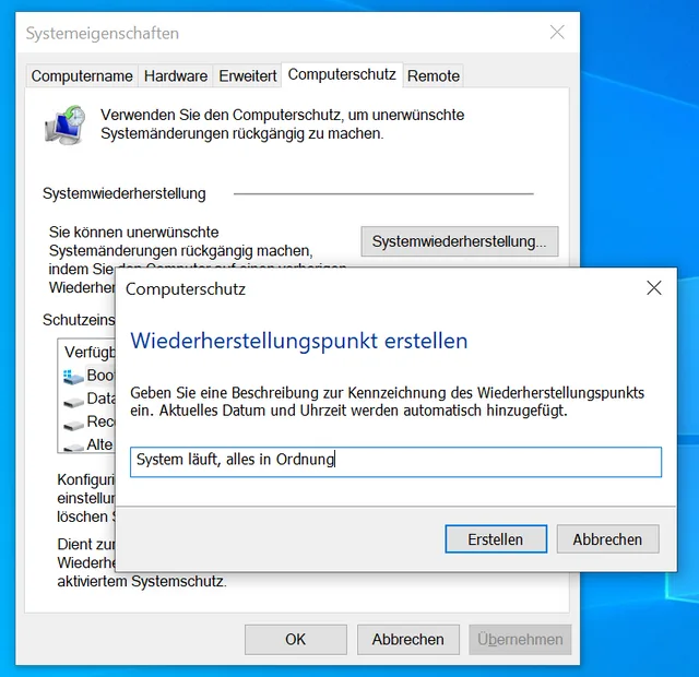 Bild 11: Sichern Sie einen funktionierenden Zustand in einem Systemwiederherstellungspunkt
