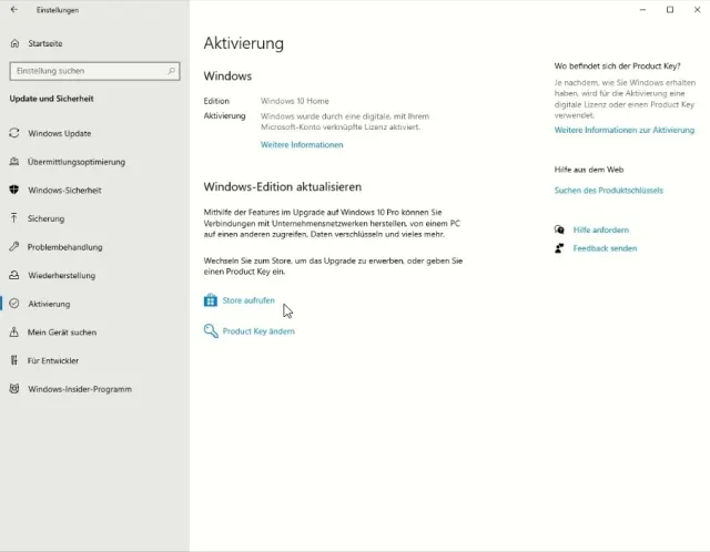 Hier liesse sich via «Store aufrufen» ein Key kaufen, den Sie anschliessend via «Product Key ändern» aktivieren können