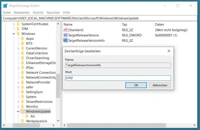 Nun folgt ein weiterer Rechtsklick in die rechte Fensterhälfte, diesmal gefolgt von Neu/Zeichenfolge. Nennen Sie diesen Eintrag TargetReleaseVersionInfo und klicken Sie auf OK. Nach einem Doppelklick auf den neuen Eintrag setzen Sie den Wert auf 21H2. Das ist die derzeit letzte Windows-10-Version.