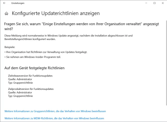 In beiden Fällen starten Sie nun den PC neu. Die Sicherheitsupdates werden weiterhin eintrudeln. In den Einstellungen unter Windows Update erscheint ab diesem Zeitpunkt die rote Meldung «Einige Einstellungen werden von Ihrer Organisation verwaltet». Der Klick auf Konfigurierte Updaterichtlinien anzeigen gibt Auskunft über die angewandten Richtlinien zur Zielversion.