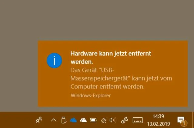 Erst, wenn danach diese Meldung erscheint, darf man den Stick oder die USB-Platte gefahrlos ausstöpseln