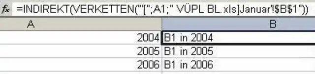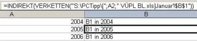 Mit der Funktion "VERKETTEN" basteln Sie den Bezug zu der entsprechenden Datei zusammen. Die Jahreszahl, in der Mitte der Formel, wird aus der Zelle A1 übernommen. Damit Excel diesen Text als Bezug erkennen kann, muss das Ganze zum Schluss in die Funktion "INDIREKT" gepackt werden.
