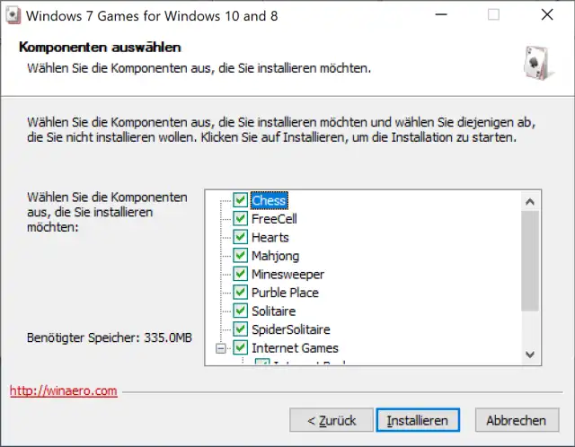 Quelle: PCtipp.chIm Installationsassistenten klicken Sie auf Weiter. Anschliessend können Sie die gewünschten Spiele an- oder abhaken. Vielleicht geht es Ihnen wirklich nur um Minesweeper und Solitaire. Die Autorin hat bei ihrem Versuch alle Games installiert. Stellen Sie sicher, dass Sie genug Platz haben. Die Komplettinstallation belegt 335 Megabytes; das ist aber relativ wenig (eine halbe CD-ROM).