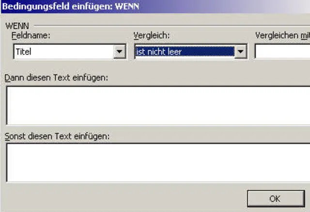 Öffnen Sie ein Bedingungsfeld (Wenn...Dann...Sonst) und füllen Sie den "Feldnamen" mit dem ersten Seriendruckfeld (Titel) und "Vergleich" mit "Ist nicht leer" aus.