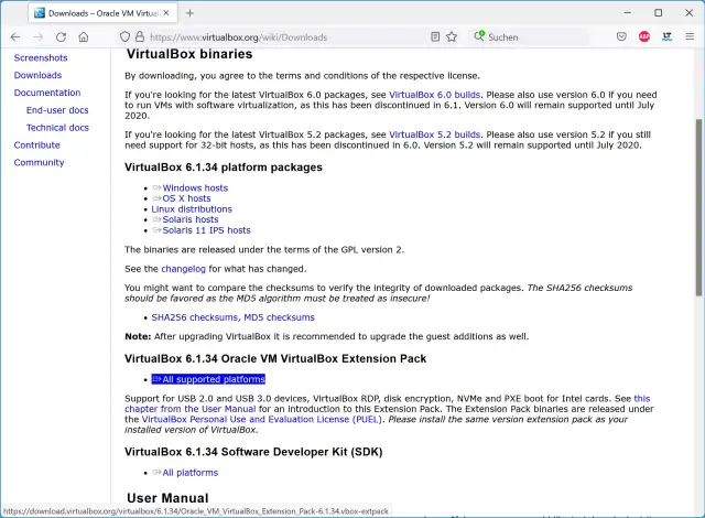 Lösung: Standardmässig unterstützt VirtualBox nur USB 1.1 (OHCI), über welches es mit USB-Mäusen und -Tastaturen umgehen kann. Ihrem System (dem Host, also dem richtigen PC) fehlt ziemlich sicher noch das «VirtualBox Extension Pack». Surfen Sie zur Download-Seite von VirtualBox. Unterhalb der «VirtualBox 6.1.34 platform packages» treffen Sie auch aufs «VirtualBox 6.1.34 Oracle VM VirtualBox Extension Pack». Laden Sie dieses herunter. Fahren Sie Ihre VirtualBox herunter, schliessen Sie VirtualBox und installieren Sie das Extension Pack.