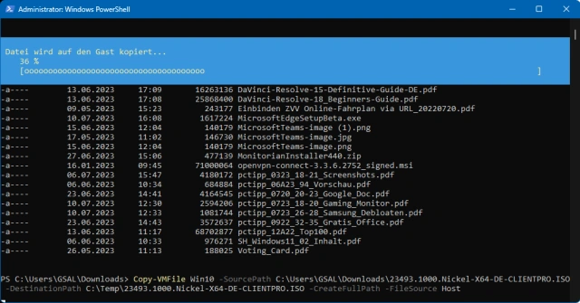 Copy-VMFile Win10 -SourcePath C:\Users\GSAL\Downloads\23493.1000.Nickel-X64-DE-CLIENTPRO.ISO -DestinationPath C:\Temp\23493.1000.Nickel-X64-DE-CLIENTPRO.ISO -CreateFullPath -FileSource Host