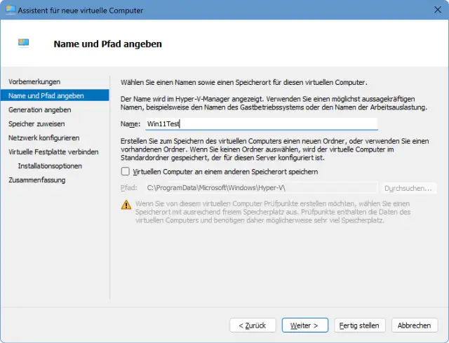 Verwenden Sie daher in der rechten Spalte den Punkt Neu/Virtueller Computer und klicken Sie auf Weiter. Geben Sie einen Namen für den Computer ein, zum Beispiel Win11Test.