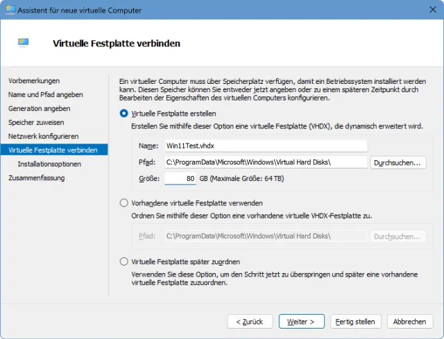 Der nächste Punkt ist Netzwerk konfigurieren. Schalten Sie hier auf Default Switch um. Danach folgt Virtuelle Festplatte verbinden, in welchem Virtuelle Festplatte erstellen aktiv ist. Bei der Grösse schlägt es uns 127 GB vor. Auf unserem Testrechner, der insgesamt nicht viel Platz hat, ist das etwas viel. Das Minimum für Windows 11 ist 64 GB. Wir ändern es bei uns einmal zu 80 GB.