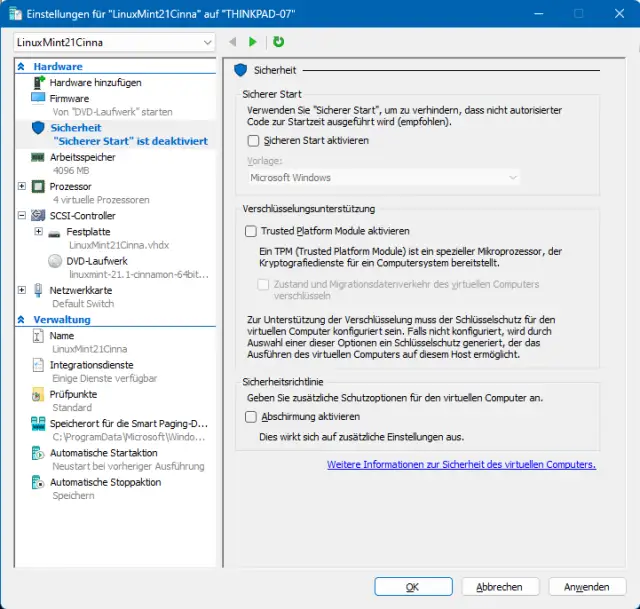Jetzt folgen noch kleinere Anpassungen, bevors losgeht. Klicken Sie im mittleren Teil des Hyper-V-Managers Ihre neue VM an (z. B. LinuxMint21Cinna) und öffnen Sie in der rechten Spalte die Einstellungen. In der linken Spalte gehts zu Sicherheit. Deaktivieren Sie dort Sicheren Start aktivieren (damit ist Secure Boot gemeint). Stellen Sie auch sicher, dass TPM nicht aktiviert ist. Und im Bereich Verwaltung/Integrationsdienste versuchen Sie auch hier das Aktivieren der Gastdienste. Bestätigen Sie mit OK.