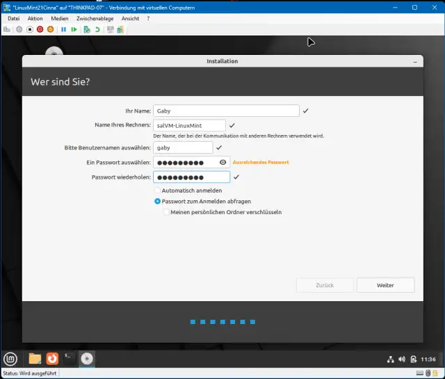 Der nächste Weiter-Klick führt zur Frage, ob Sie Multimedia-Codecs verwenden wollen, um in der VM beispielsweise MP3s oder bestimmte Videoformate abzuspielen. Aktivieren Sie die Option und klicken Sie auf Weiter. Bei der Installationsart übernehmen Sie «Festplatte löschen und Linux Mint installieren», indem Sie auf Jetzt installieren klicken. Im nächsten Schritt wählen Sie für die Zeitzone noch kurz Ihren Ort aus. Daraufhin geben Sie Ihren Namen ein und einen Namen für die VM. Ich greife zu salVM-LinuxMint. Beim Benutzernamen übernehmen oder ändern Sie allenfalls den Vorschlag und geben zweimal dasselbe Passwort ein, das Sie sich natürlich merken müssen.
